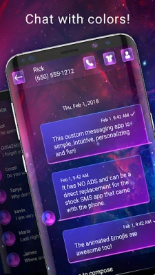 Customize your chat with emoji, stickers, and a colorful neon theme.