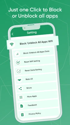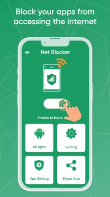 The interface of the internet blocker application / blocker shield has four main features including all apps, settings, VPN settings, and share apps. The all-apps feature of internet blocker for apps / wifi blocker allows the user to view all the apps installed on the device. The VPN setting feature of internetblocker lets the user manage the VPN settings of the device. The settings feature of the block internet to use app authorizes the user to manage the settings of the app. Finally, the share app feature of the internet blocker app / stop internet permits the user to share the app with friends and family.