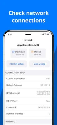- Provides WiFi information & analysis with network details (SSID, BSSID, vendor, IP address, IPv6 address, subnet mask, broadcast, WiFi security type, WiFi channel and bandwidth)