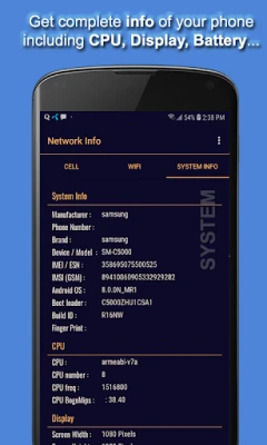 •SYSTEM INFO: System information like manufacturer, brand, model, IMEI, IMSI, Operating system is shown in System info.
