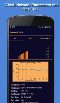 Network Signal Info is a Network Monitoring tool. Using this app you can measure Cell tower Signal Level and Network Operator parameters , Neighbor Cells Signal level. You can also find Neighbor cell Signal Strength level. The Wifi Tab shows all the information regarding Wifi Connectivity including but not limited to SSID, BSSID, Wifi Speed, Frequency and Channel. The Tab System info shows information related to phone hardware including Manufacturer, Brand, IMEI etc. You can also find CPU Speed, number of CPUs, Display Width and Height, and Battery Information.