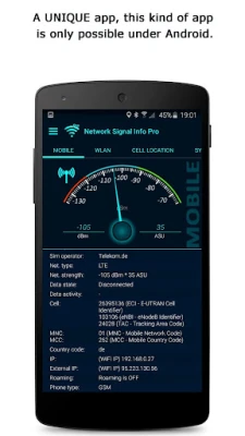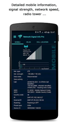 "Network Signal Info" provides detailed information over the currently used network with accurate signal strength output, whether WiFi (WLAN) or cellular (mobile) connection and is easy to use.