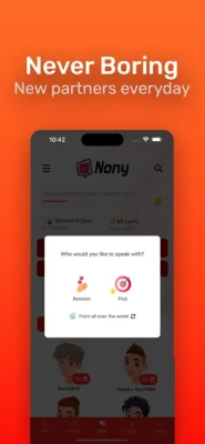 Welcome to Nony! Exciting chats with a variety of fascinating topics to talk about! We will 'break the ice' and provide interesting conversation topics, and you? All you need to do is to chat with new friends and enjoy Nony, for free!