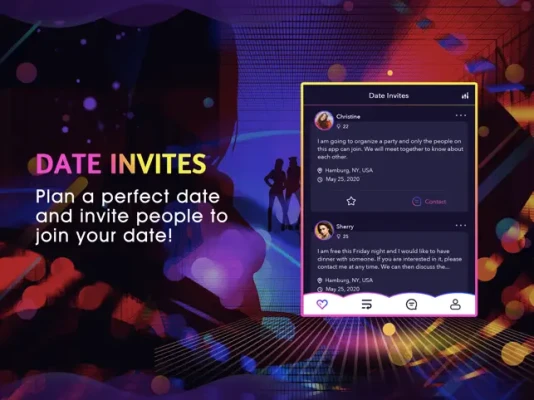 Plan a date and share the details — time, place, and what you’d like to do. Others can discover your invite and join you, turning chats into real meet-ups faster.