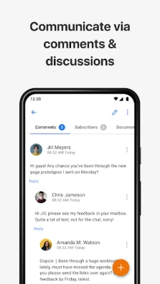 Start discussions to brainstorm with your team, solve issues, ask questions, and make announcements. Take part in communication using comments. Quickly access documents related to discussions. Search discussions by name, filter and sort them.