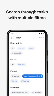 Find any task in seconds. Filter your search by creators and responsible users, projects, milestones, and dates. Sort tasks by deadline, priority, creation date, start date, or order.