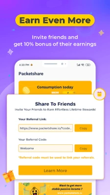 Invite friends to use your referral code to join Packetshare to make money, and you will permanently receive 10% of your friends' income
