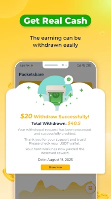 Earn Money with your Phone, exchange your accumulated PacketShare points into real cash, The minimum payout amount is just $10, Cash out your earnings through PayPal and enjoy your free cash