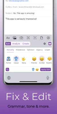 Improve your grammar, spelling, and writing skills using science-based writing strategies designed for effective communication. Quickly generate replies to any message, chat, or email using our AI keyboard. Effortlessly write and edit text directly in any app.