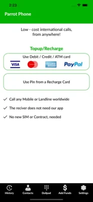 • Call any Mobile phone or Landline worldwide.• Reach people without the app or internet.• Super low rate International calling and text from anywhere.• It is the cheapest way to call any number worldwide• There are no hidden fees, no setup fees, no monthly charges or any maintenance fees of any sort.• Uses your real caller ID, so people will know that you are the one calling.• It turns your phone into a Global Phone enabling you to Call easily and save big on your phone bill when travelling abroad. (Better than a calling card)• Parrot Phone calls over your mobile data or WiFi.• The audio quality is great
