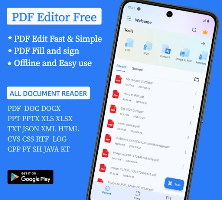 PDF Editor : PDF Fill & Sign. Add signatures, passwords to protect PDF files, edit text, images, and annotations in PDFs, and more. PDF Reader and Manager. All Document Reader, DOC, XLS, PPT, TXT, CVS File Viewer.