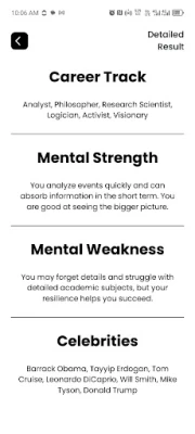 Using a combination of modern psychological theories and classic assessments, our app is tailored to provide an in-depth look into your mind. By answering carefully crafted questions, you'll receive a detailed personality profile that highlights your strengths, weaknesses, cognitive functions, and interpersonal tendencies.