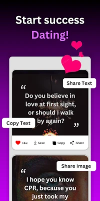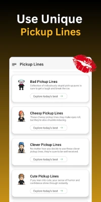 Introducing Pickup Lines, the ultimate app for crafting charming banter and sparking romance! With a vast collection of flirty messages, cheesy pickups, and sweet compliments, this app is your go-to for igniting connections and spreading smiles. Whether you're flirting with a crush or spicing up your relationship, our carefully curated selection of romantic lines and cute conversations will make you the master of love language. Download Pickup Lines now and let the fun begin!