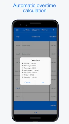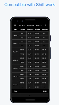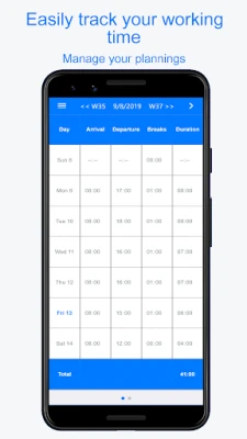 👍 Only one screen (like a calendar) to easily clock in/out each day and week working hours (arrival time, departure, breaks, comments and notes, hourly rate...). Create and use predefined hour templates (morning week, evening week…)