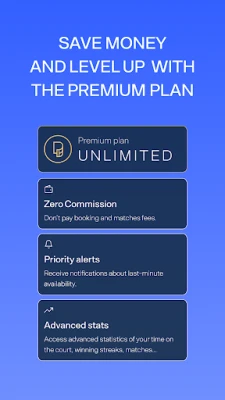 Once you become a Premium member, you can enjoy an unlimited experience. Save money on every transaction and avoid additional court booking fees. Moreover, you'll receive personalized priority alerts. You'll have the ability to choose which notifications you'd like to receive based on your preferences, so you can stay updated on matches, court availability, and last-minute opportunities. Your time is valuable, and it's valuable to us too!