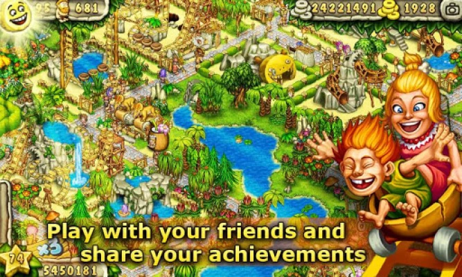 ★ You can choose from more than 60 mind boggling attractions and rides: giant wooden swings, trampolines made from mammoth hide, giddy merry-go-rounds, stone slides, extreme roller coasters, water rapids and even dinomotors powered by real huge Jurassic dinosaurs to make all these rides run!