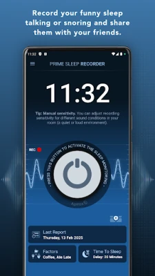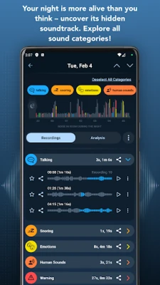 Records your talk or snoring while you are asleep (automatic or manual sensitivity level, records only snoring using smart snoring detection), creates the graph of noise in room during the night, takes the total time of snoring down.