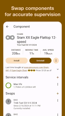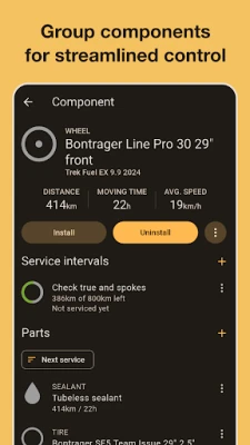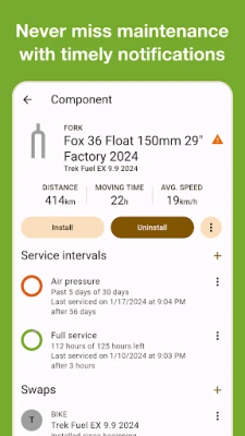 ✔️ Receive timely notifications for component maintenance or replacement. For example, when your MTB suspension fork hits 120 hours of use, your road bike waxed chain clocks 400 km, or your gravel tires reach 5000 km.