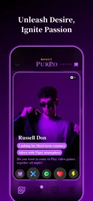 WHY CHOOSE PURPO?1. Two Sides, One AppEffortlessly switch between your romantic and adventurous sides. Find matches that align with your vibe—judgment-free.2. Privacy You Can Count OnYour safety is our top priority. With features like screenshot protection, disappearing messages, and full anonymity, you can connect with confidence.