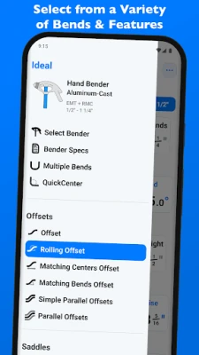 There's no limit to QuickBend. Easily, select between different types of benders and choose the size of the shoe and conduit type all within the same screen that you are working on. No need for complex navigations. In addition, you can pin benders you use the most, so you can select and switch between them quickly without consistently scrolling. All benders are spec'd out using the information provided by the manufacturers. There's also an option to not select a bender and use the multiplier method.