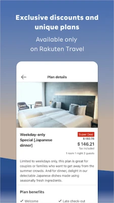 Enjoy exclusive discounts and offers -Discover great deals and unique plans available only on Rakuten Travel -Become a member for free and enjoy special benefits