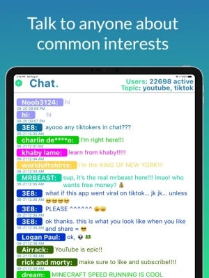 Topic Based Chat lets you talk to anyone with the same chat topic. First, choose a topic or a character combination. Then, anyone with the same character combination will be in the same chat room with you. You can use this feature to talk to the world about popular subjects or create a private chat room with your friends or events.