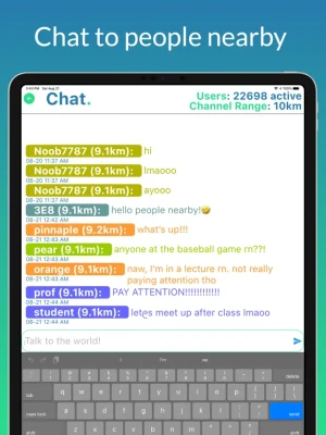 The location based chat lets you talk to anyone within a, 500m, 10km, or 100km radius of you! This feature is perfect for large social gatherings, like sports, concerts, or events. Instead of just talking to people who can hear you, Rambl lets you talk to anyone within your specified radius.