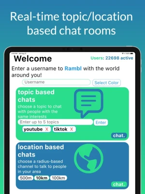 Rambl is a series of chat rooms where you can talk to people within a certain distance from you or to the world about a certain subject. Rambl gives any location or topic a realtime public chatroom!