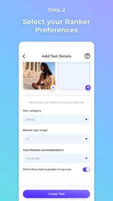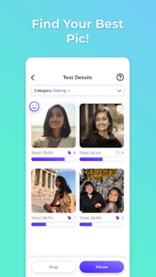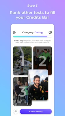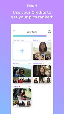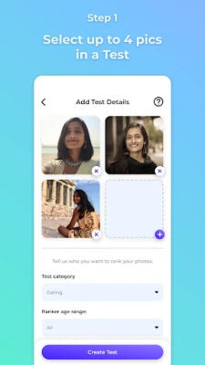 - upload up to 4 photos in a test - get credits by ranking other people's photos - use credits to get your photos ranked from best to worst - set location, attraction and age preferences for the people ranking your photos