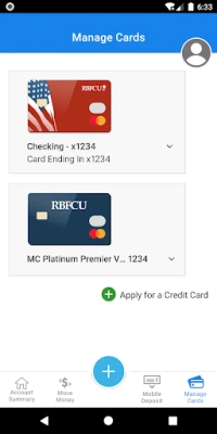 • Freeze your RBFCU debit or credit card, or report it lost or stolen and more with Manage Cards