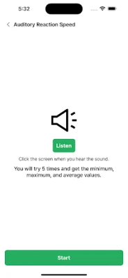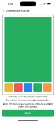 1. Test your visual reaction time. • Measure your reaction time by detecting a change on the screen and clicking. 2. Test your auditory reaction time. • Measure your reaction time by recognizing a sound effect and clicking. 3. Test your color reaction time. • Measure your reaction time by clicking the button corresponding to each color.