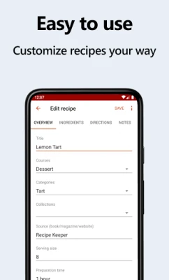 Enter your recipes with as much or as little information as you like. Copy and paste recipes from your existing documents or apps. Categorize your recipes by course and category. Add photos, rate your recipes and flag your favorites.
