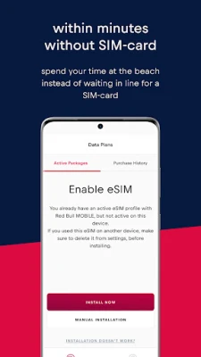 The easy way to buy international data at a super fair price! Without obligations, no additional subscription, no strings attached. Get a data bundle to use abroad - no surprise of an outrageous bill once you are back home. All you have to do is to download the App. The Red Bull MOBILE Data App provides your data plan that does NOT require a physical SIM card!