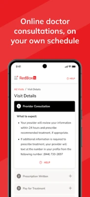 • View current and previous consultations with RedBox Rx providers, including doctor notes, status of prescribed medications and shipment tracking.