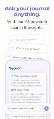 Using AI-enhanced search, ask your journal anything! Find notes, track themes, or identify patterns in your emotional journey.