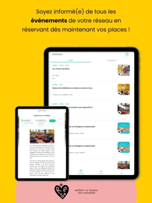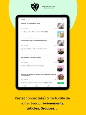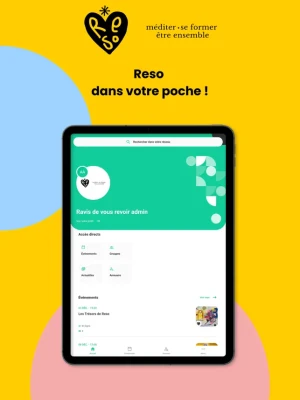 App de Reso, l'association pour méditer, se former et être ensemble. Bibliothèque de ressources en ligne pour les membres de l'association. Agenda des évènements, forum et annuaire