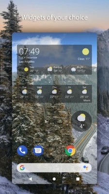 In a realistic weather application there are several types of widgets: a round widget for 1 cell showing the temperature and probability of precipitation, a widget with weather for 3 days and hours, as well as a widget with weather for 5 days. Any widget can be made transparent or choose a background color in the settings when added to the desktop.