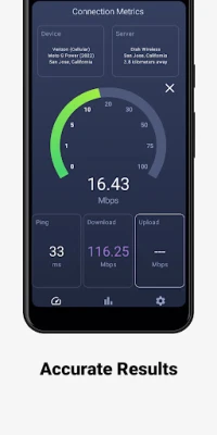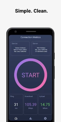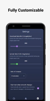 Features: - Test your download and upload speed, and measure your latency (ping) - Optimize your tests using the server closest to you - Limit your data usage during tests using customizable thresholds to avoid going over data caps and allowances - Track the history of all your previous speed tests - Automatically run speed tests whenever you connect to a new network - Detailed explanations about each phase of the speed test and why it matters to you