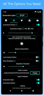 • Change screenshots saving location(Folder). (Click on 'Gear' icon in Notification OR open 'Capture Settings' in app's menu to change Folder)