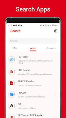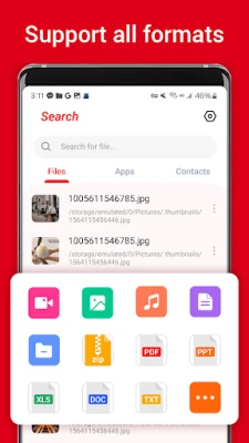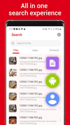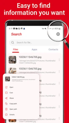Since we have hundreds and thousands files on our phone ,find what you want between such an amout of files is quite annoying .This Search everything-fast file searcher tool is the right choice that can save you ,you type keywords and the results show within no more than a second ,you don't have to wait seconds anymore .Now it's time to try this super search engine and fire your day !