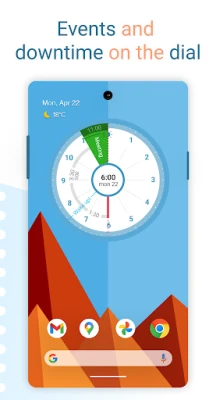 The scheduler works like an analog clock face. It automatically fetches all the events from your Google calendar (or local calendar) and places them on a 12-hour sectored watch face. This technology can be called a "Calendar clock".