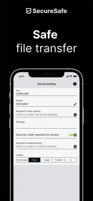 • SecureSend: Thanks to SecureSend, you can encrypt and send up to 2 GB large files to any recipient of your choice (recipient does not need SecureSafe to download file).