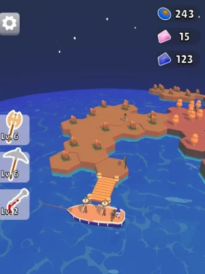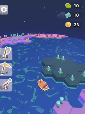 Get your axe and start to move up into the island, gather tree logs along the way and upgrade your tools. Craft your boat and sail to other islands. You need to craft new ships to sail other islands.