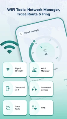 • Wi-Fi Signal:Detect and analyze Wi-Fi signal strength with nearby Wi-Fi details. Trace your connected Wi-Fi network, run a ping test, and see connected devices.