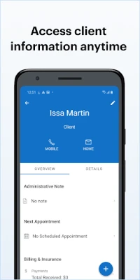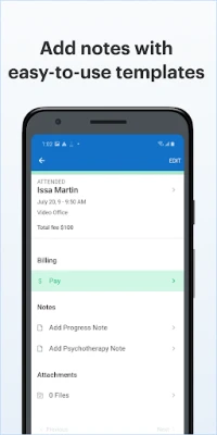 - Protect your data with HIPAA-compliant security - Manage your schedule on the go - Write and review session notes - Share and upload documents - Send secure messages - Process invoices and payments