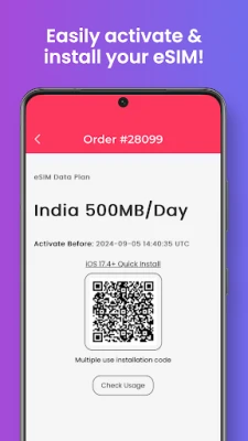 Install your travel eSIM through the app by logging in with your email. Alternatively, use the QR or manual codes provided in the email. Step-by-step guides are available in the app.
