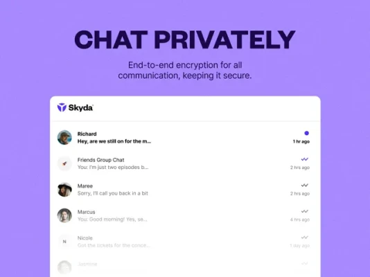 - Send text and voice messages, share photos, videos, and files for free. Skyda works over your internet, saving you from SMS and MMS charges.- Call your friends and family with high-quality, encrypted voice and video calls.- Keep in touch with loved ones through group chats.- Engage in secret chats for sharing images, texts, audios, and videos. These chats hide your username for absolute confidentiality.- Send and receive data securely using integrated private VPN feature powered by OpenVPN.- Your privacy is our priority in Skyda. We utilize the open-source Signal Protocol, making it impossible for us or anyone else to access your messages or call details.- Our commitment is clear: no back doors and no data collection.