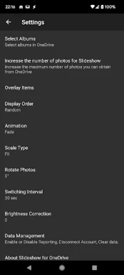 Functions - Select Albums (multiple albums or all photos) - Add overlay (widget, clock, creation time and filename) - Set display order of slideshow - Set animation at the time of picture switching - Set scale type - Set switching interval of slideshow - Set brightness collection of photos