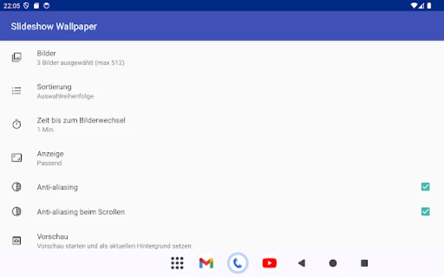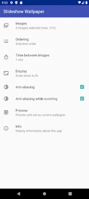 Advantages of Slideshow Wallpaper: ⭐ No permissions: This app does not need any android permissions. Not even internet. It only receives the rights to read the images you select, and revokes it when you remove them. ⭐ No ads ⭐ Free open source software: Slideshow Wallpaper is licensed under the GNU General Public License, Version 3. The source code is available at: https://www.github.com/Doubi88/SlideshowWallpaper (Feel free to suggest new features, report bugs or open pull requests there)