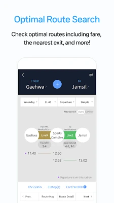 The ‘Smarter Subway’ app provides you with smarter and more convenient Korean subway trips/lifestyles with all the information including real-time arrival information, an intuitive subway route map, the optimal route and predicted time, fare, and more.